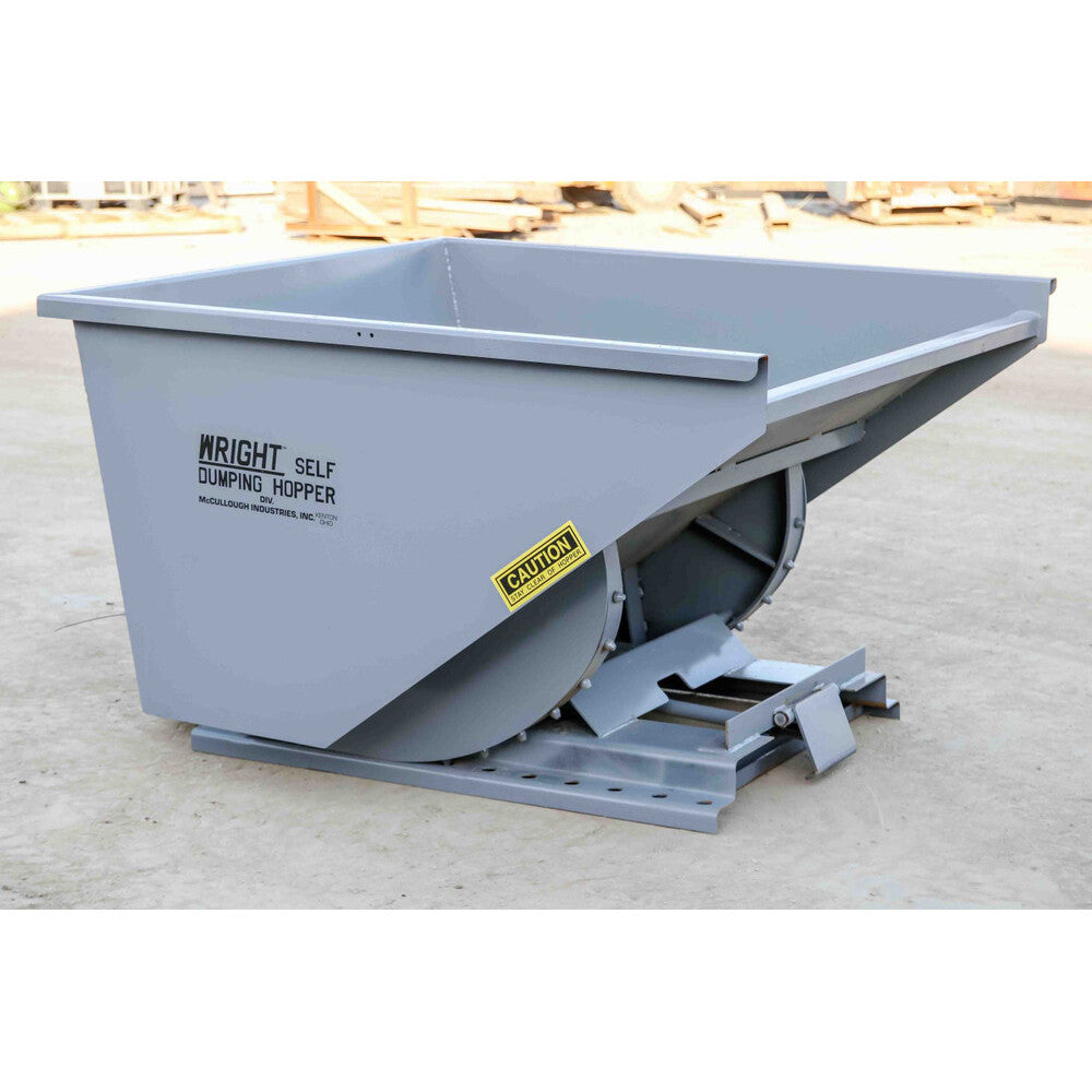 Bump release hoppers feature a steel plate on the front, designed to automatically dump their contents upon contact with the container. Wright Hoppers are made in the U.S. using American steel, ensuring exceptional quality and safety. With a perfected design that prioritizes durability and functionality, these hoppers are built to last while being safe and user-friendly. Their versatility makes them useful for a wide range of purposes, with various models available to meet your specific needs. From small tasks to large-scale projects, Wright Hoppers are built to handle it all. They simplify the process of loading, transporting, and unloading bulky materials and waste, saving you time, effort, and labor. The 3" fork slots accommodate most forklifts and pallet forks.