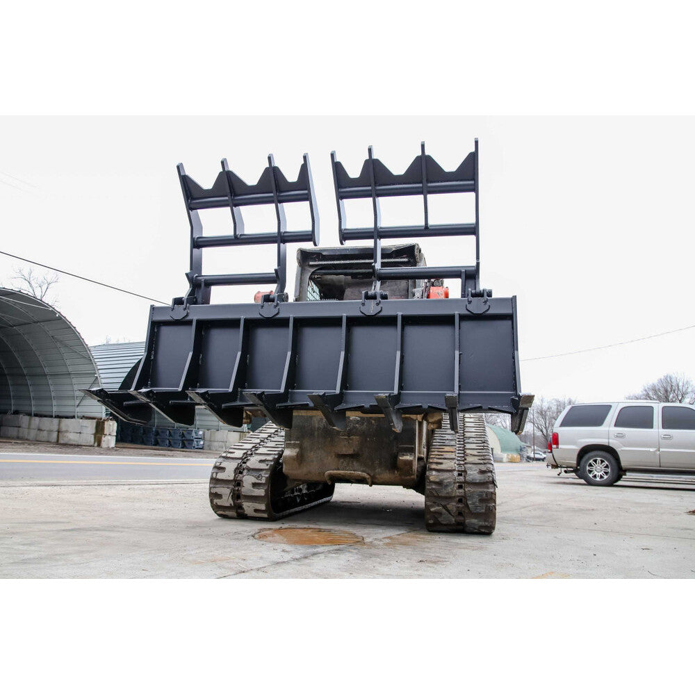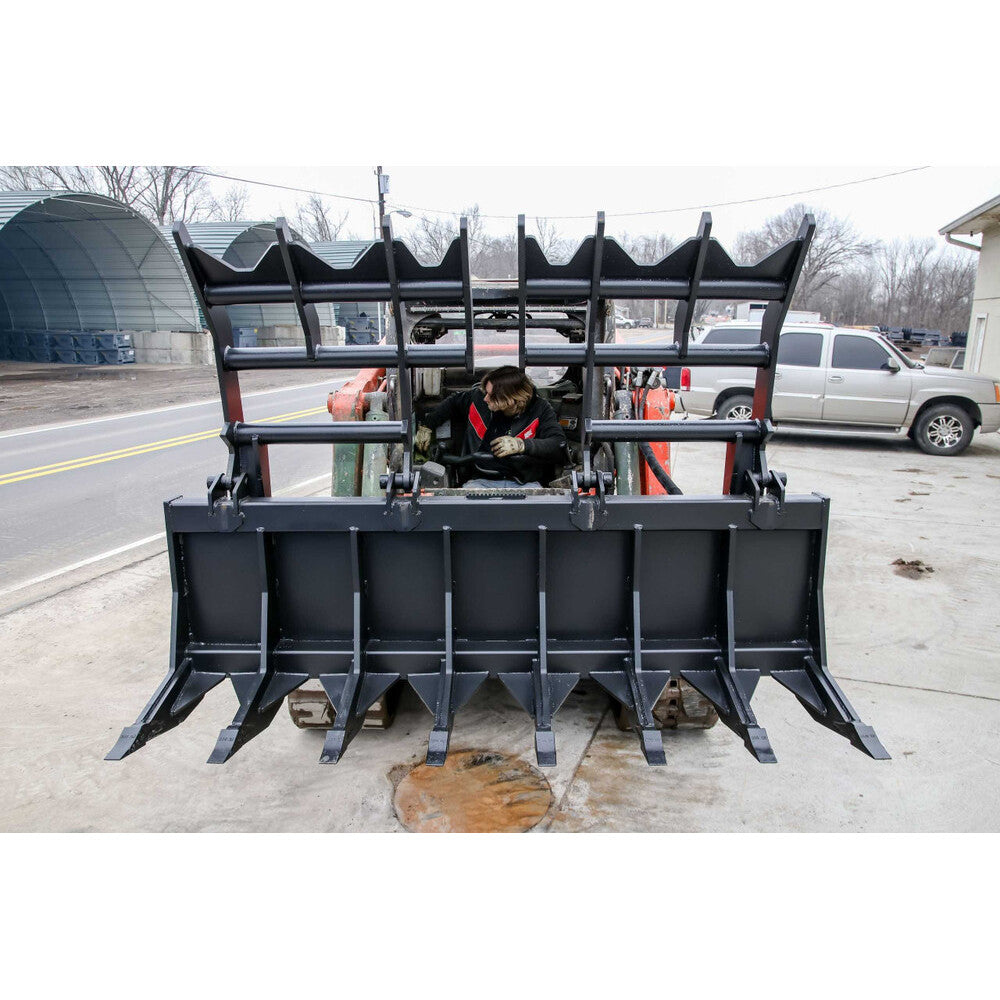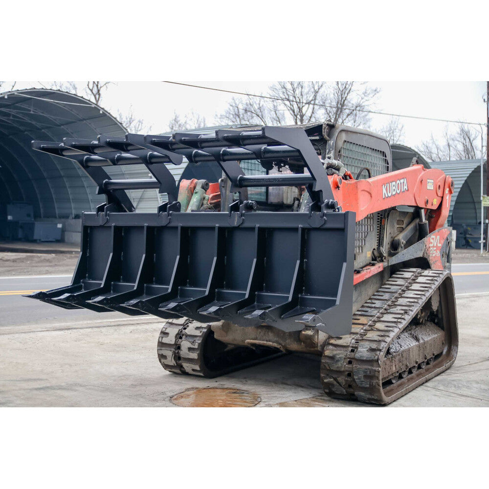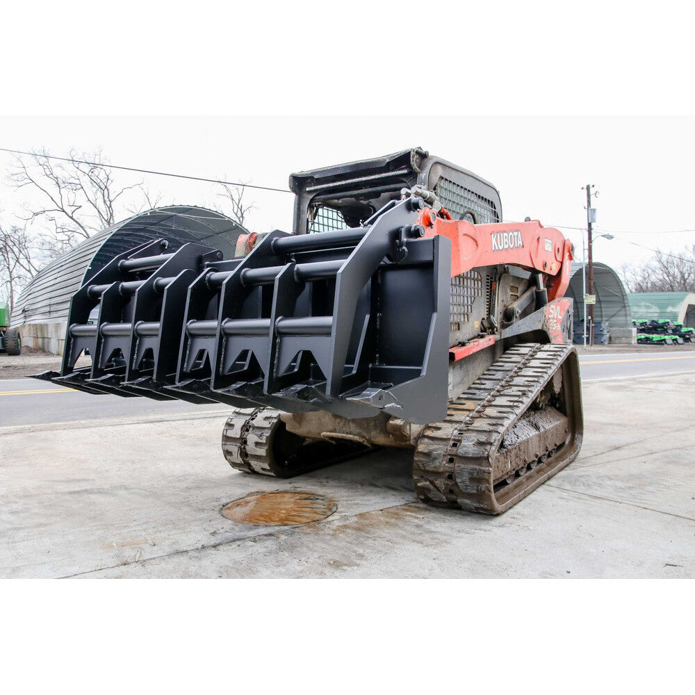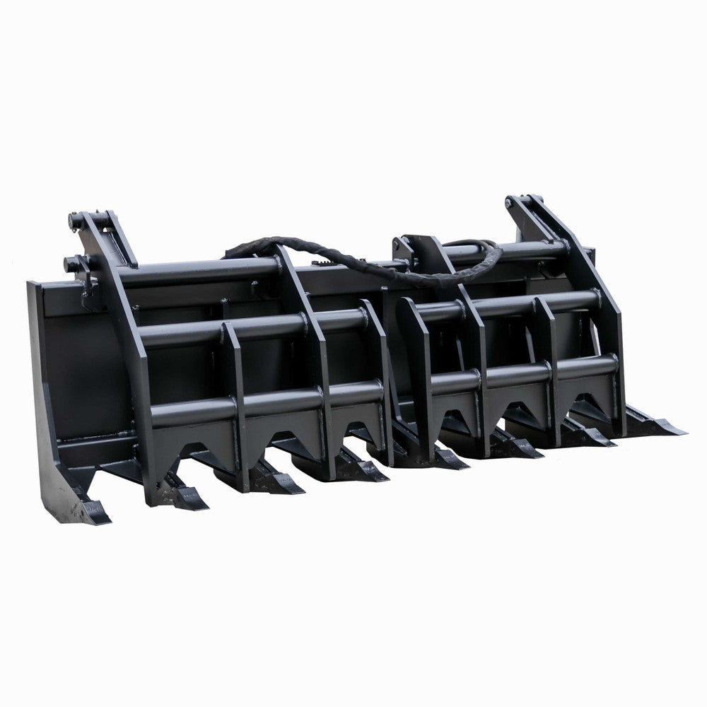 This heavy duty grapple is the perfect attachment for tackling your toughest jobs, including lifting and transporting heavy materials, such as brush, logs, debris, roots, and more. It is perfect for land clearing and functions like a rake, with tines that allow dirt to sift through easily. This multi-purpose grapple effortlessly handles everything from large-scale landscaping projects to industrial-level material handling. Equipped with Parker hoses, 1/2" flat faced fittings and couplers that will hook up to almost any skid steer hydraulic system.