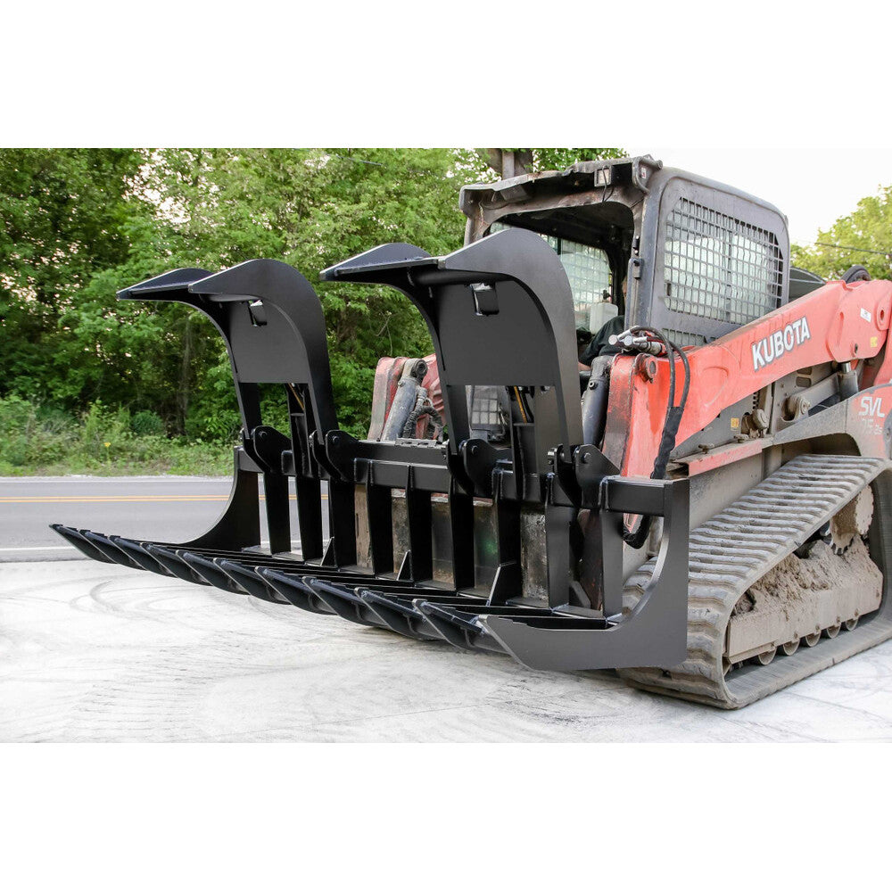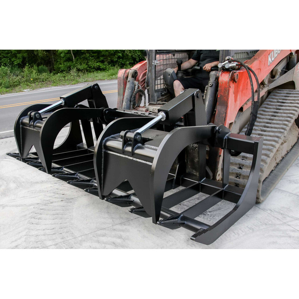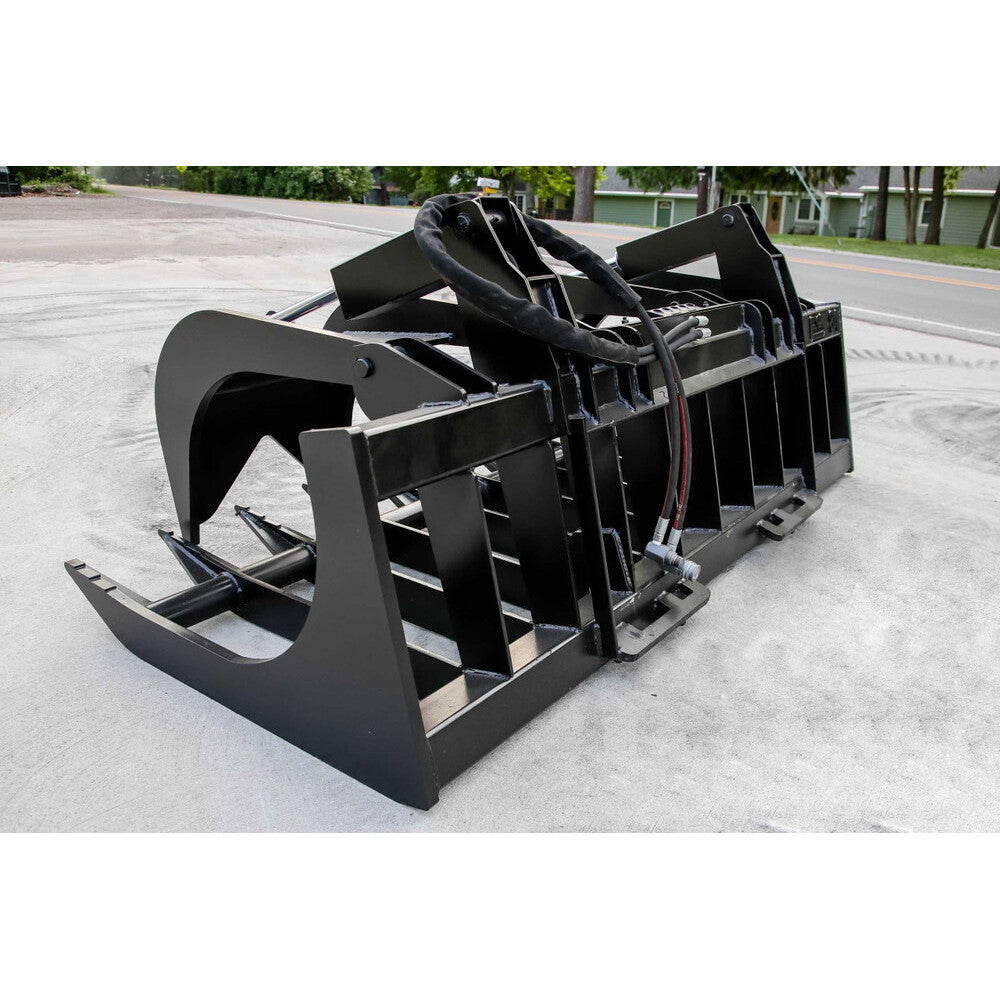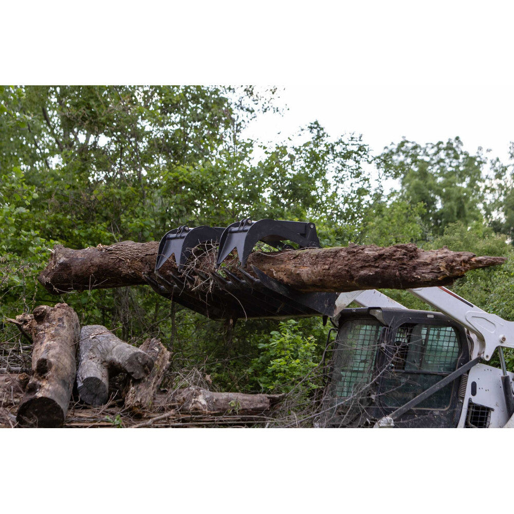 This heavy duty grapple is the ideal attachment for tackling your toughest jobs, including lifting and transporting heavy materials, such as brush, logs, stumps, roots, rocks, and more. This multi-purpose grapple is designed for effective and efficient land clearing, brush removal, and jobsite clean-up, effortlessly handling everything from large-scale landscaping projects to industrial-level material handling. Equipped with Parker hoses, 1/2" flat faced fittings and couplers that will hook up to almost any skid steer hydraulic system.